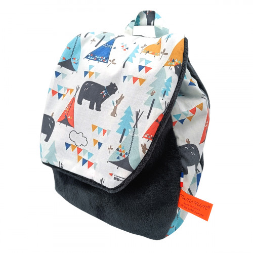 Questo zaino è realizzato con due tipi di tessuto: un lato in morbido piumino che rassicura e lenisce e un lato in cotone stampato, come il Peluche Nin-Nin !